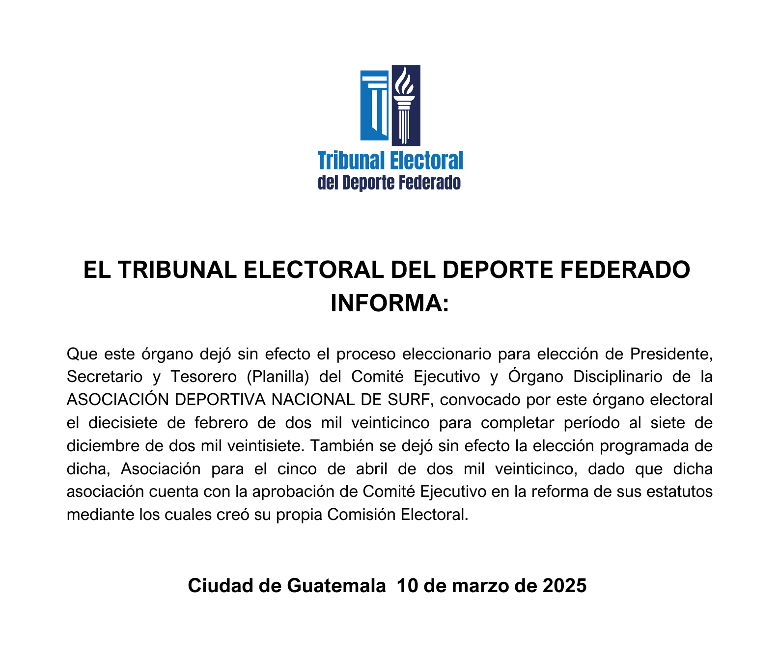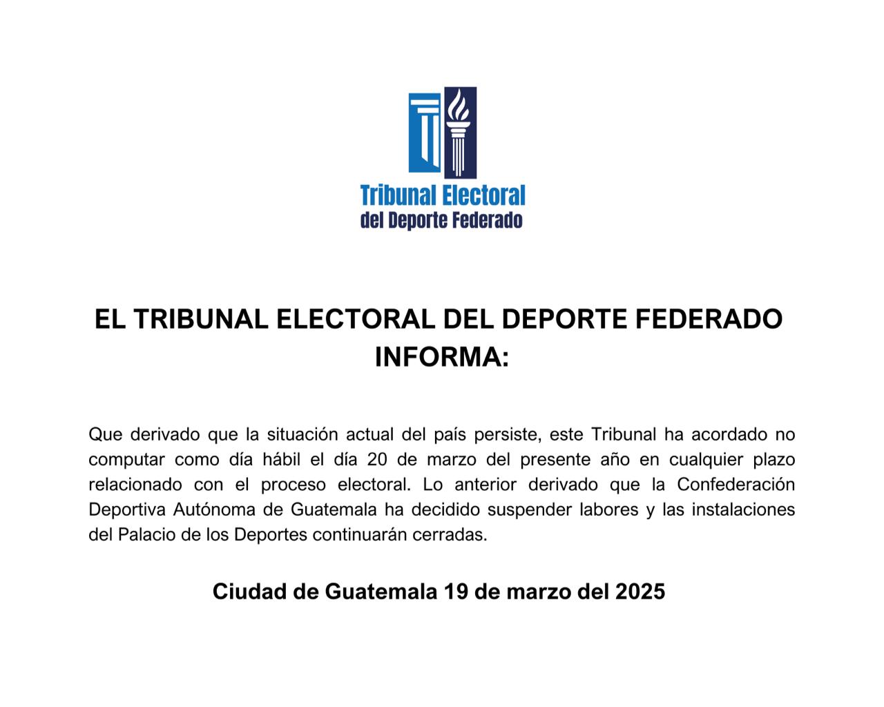 Que derivado que la situación actual del país persiste la Confederación Deportiva Autónoma de Guatemala suspendió labores.
