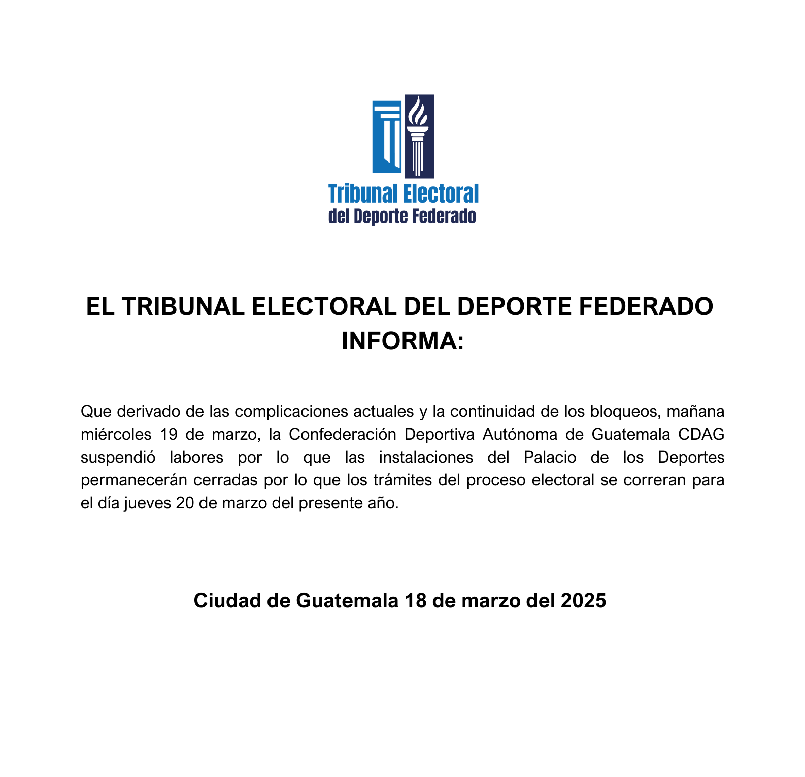 Que derivado de las complicaciones actuales y la continuidad de los bloqueos la Confederación Deportiva Autónoma de Guatemala suspendió labores el día miércoles 19 de marzo del presente año.