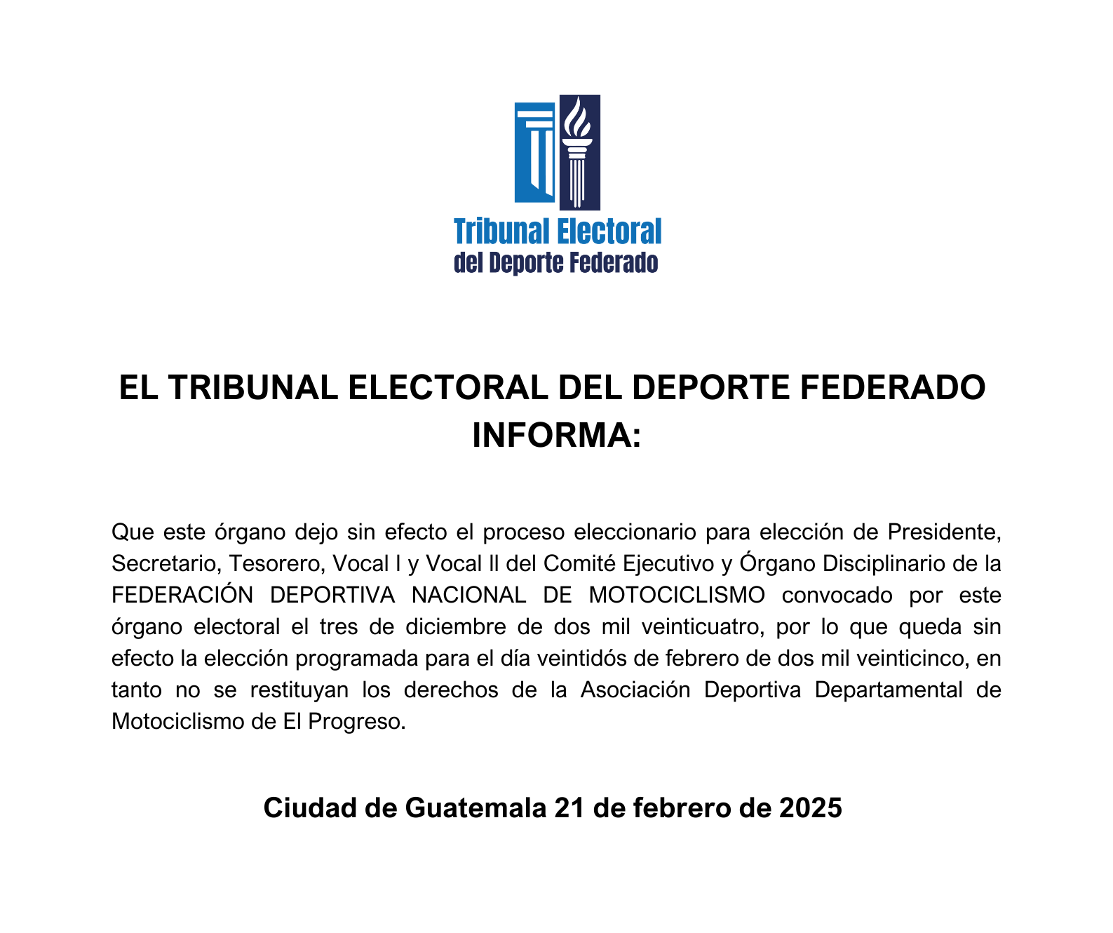 Que este órgano dejó sin efecto el proceso de elección de la Federación Deportiva Nacional de Motociclismo.