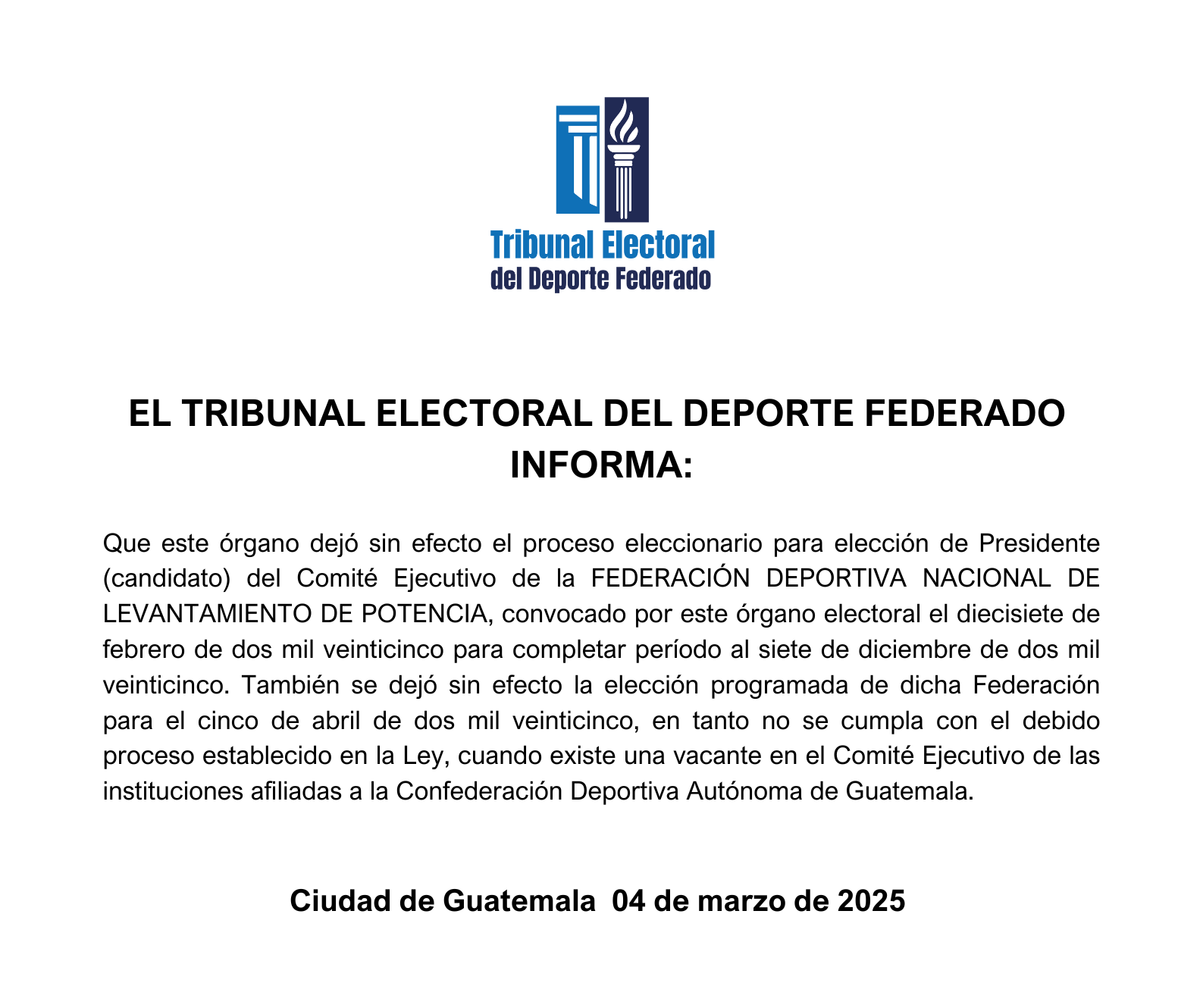 Que este órgano dejó sin efecto el proceso de elección de la Federación Deportiva Nacional de Levantamiento de Potencia