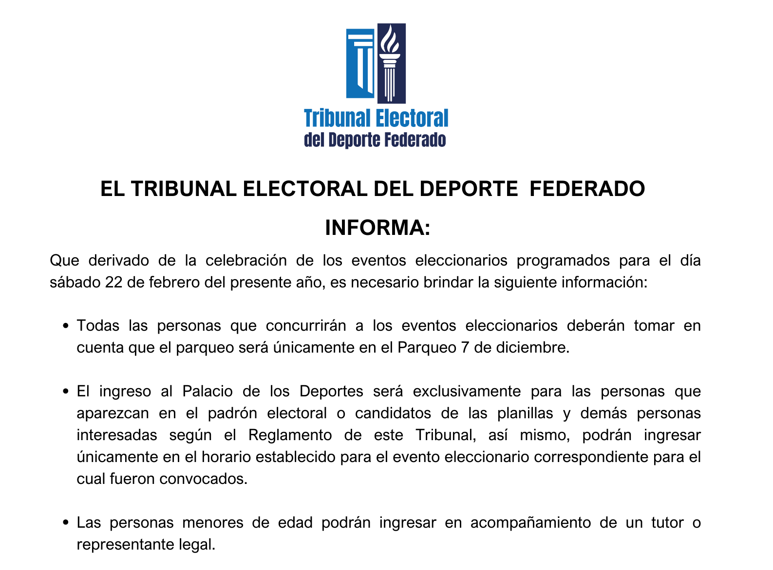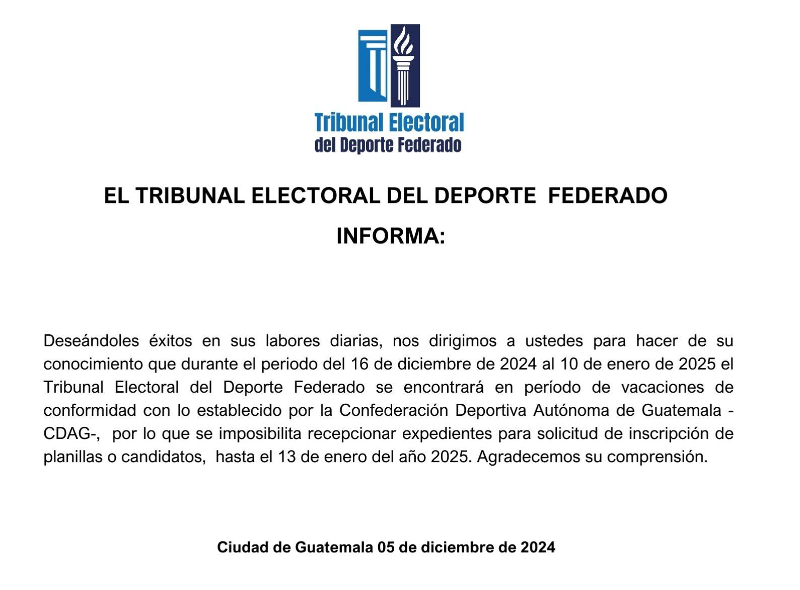 Que durante el periodo del 16 de diciembre de 2024 al 10 de enero de 2025 el Tribunal Electoral del Deporte Federado se encontrará en período de vacaciones de conformidad con lo establecido por la Confederación Deportiva Autónoma de Guatemala -CDAG-